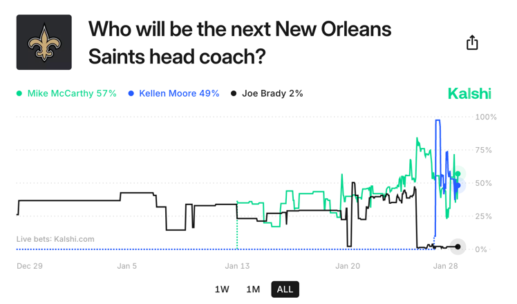 Over on prediction market Kalshi, Moore’s implied probability of landing the Saints job has skyrocketed to 49%, giving McCarthy only a slight edge over him as the top choice. The betting markets clearly see Moore’s upside as an intriguing option for a New Orleans offense that sputtered to 22nd in scoring last season and desperately needs a spark.