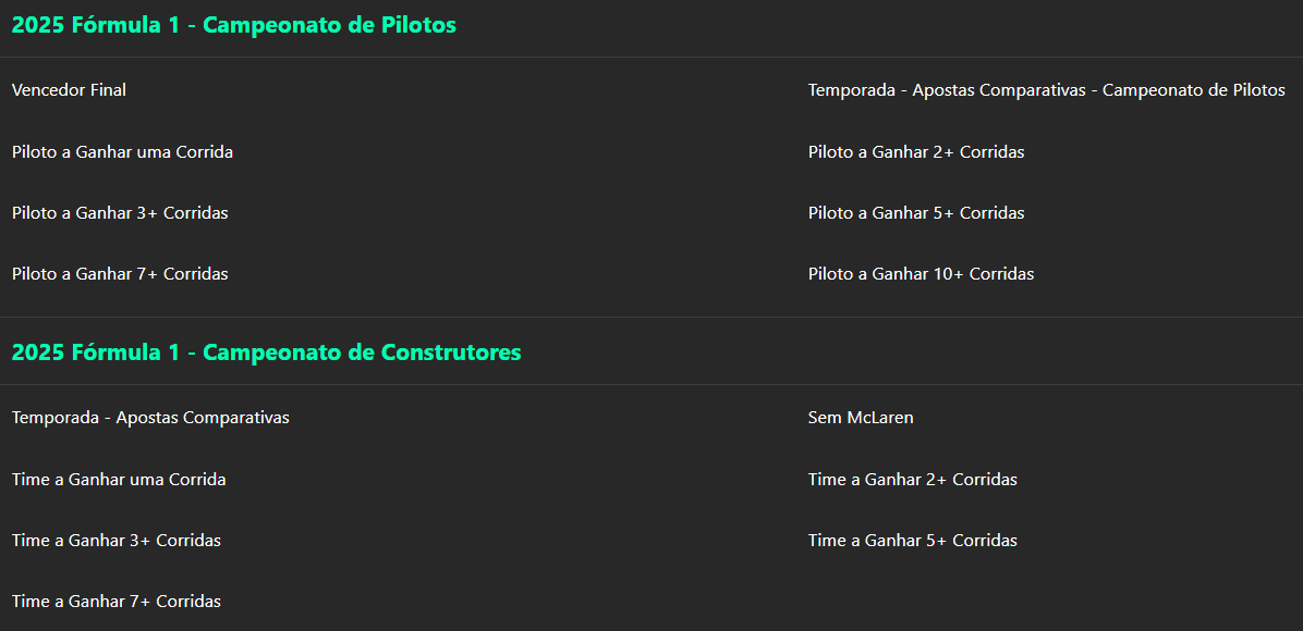 - Aposta no campeão mundial: previsões de longo prazo para piloto ou construtor que conquistará o título.
