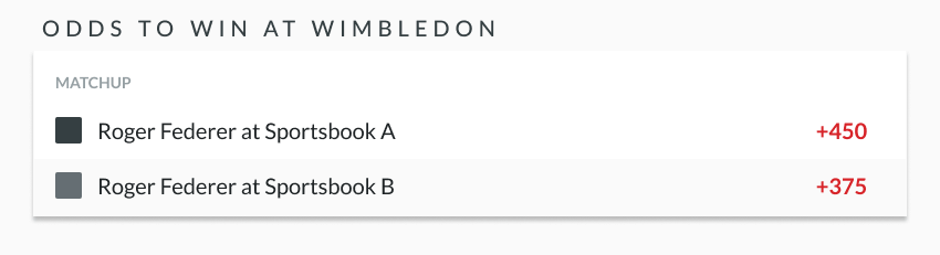 In the case of this futures line, a $100 bet at Sportsbook B would pay $375 if Federer won whereas the same $100 bet at Sportsbook A would pay $450.