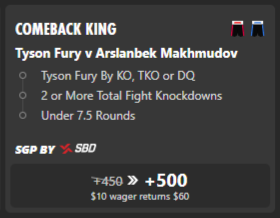 Speaking of bet365, we also have a special SGP boost on the big fight that new users and existing users can both take advantage of on the app or site. Look for the boost below that is currently at +500 odds, boosted from +450, for Fury to win by KO, TKO, or DQ, 2 or More Total Fight Knockdowns, and Under 7.5 Rounds.