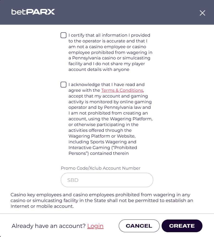 - The link will automatically supply the betPARX Casino bonus code “SBD” to your registration.