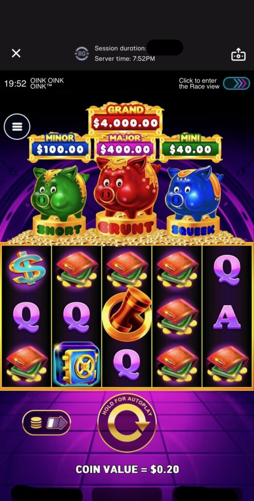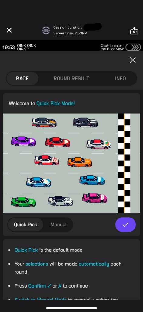 They opted to use the “auto spin” on Oink Oink Oink. When clicking on the auto option, the reels spun like they would at a legal online casino. The user did this about five times, with each play resembling a slot spin. It wasn’t until accessing the game results option that they received the past motor race results and saw how their spin outcomes were determined.