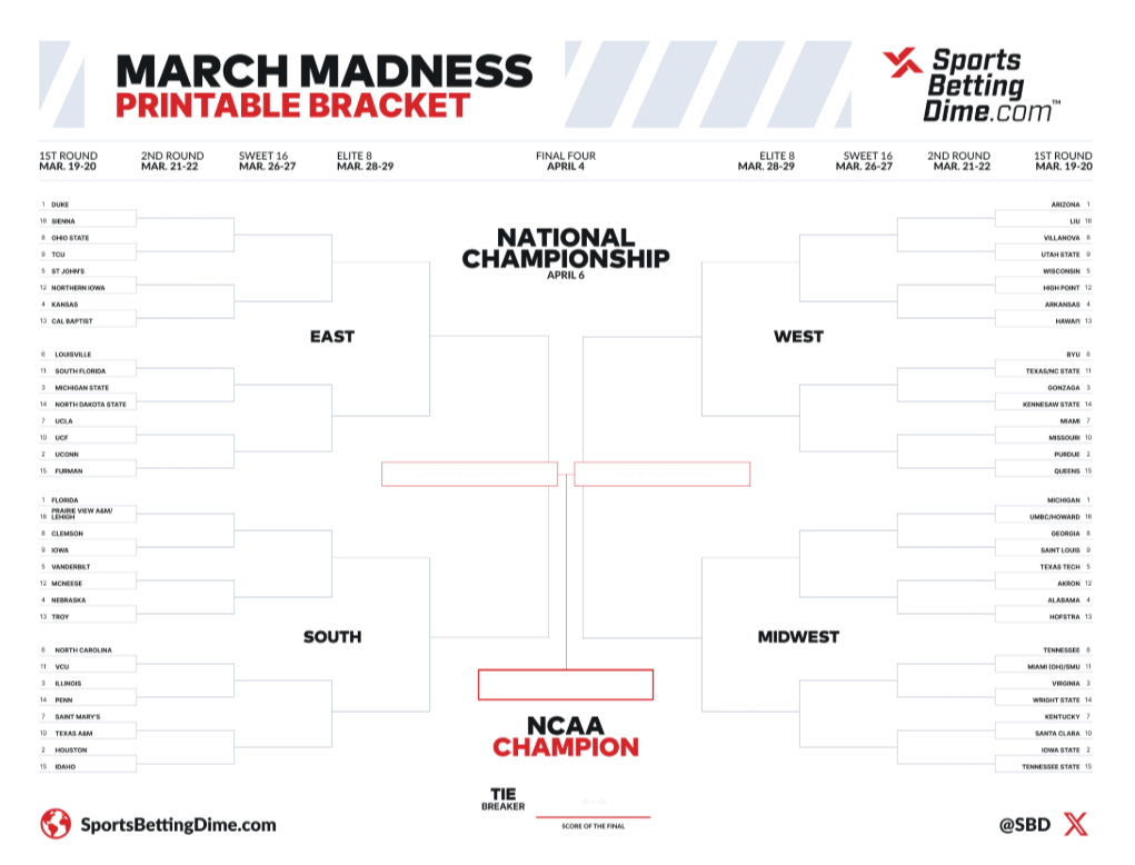 SBD’s printable March Madness bracket for the 2026 NCAA Tournament is below. You can download the PDF by clicking on the bracket itself. Under the bracket, there is also a dedicated link to download the same PDF.