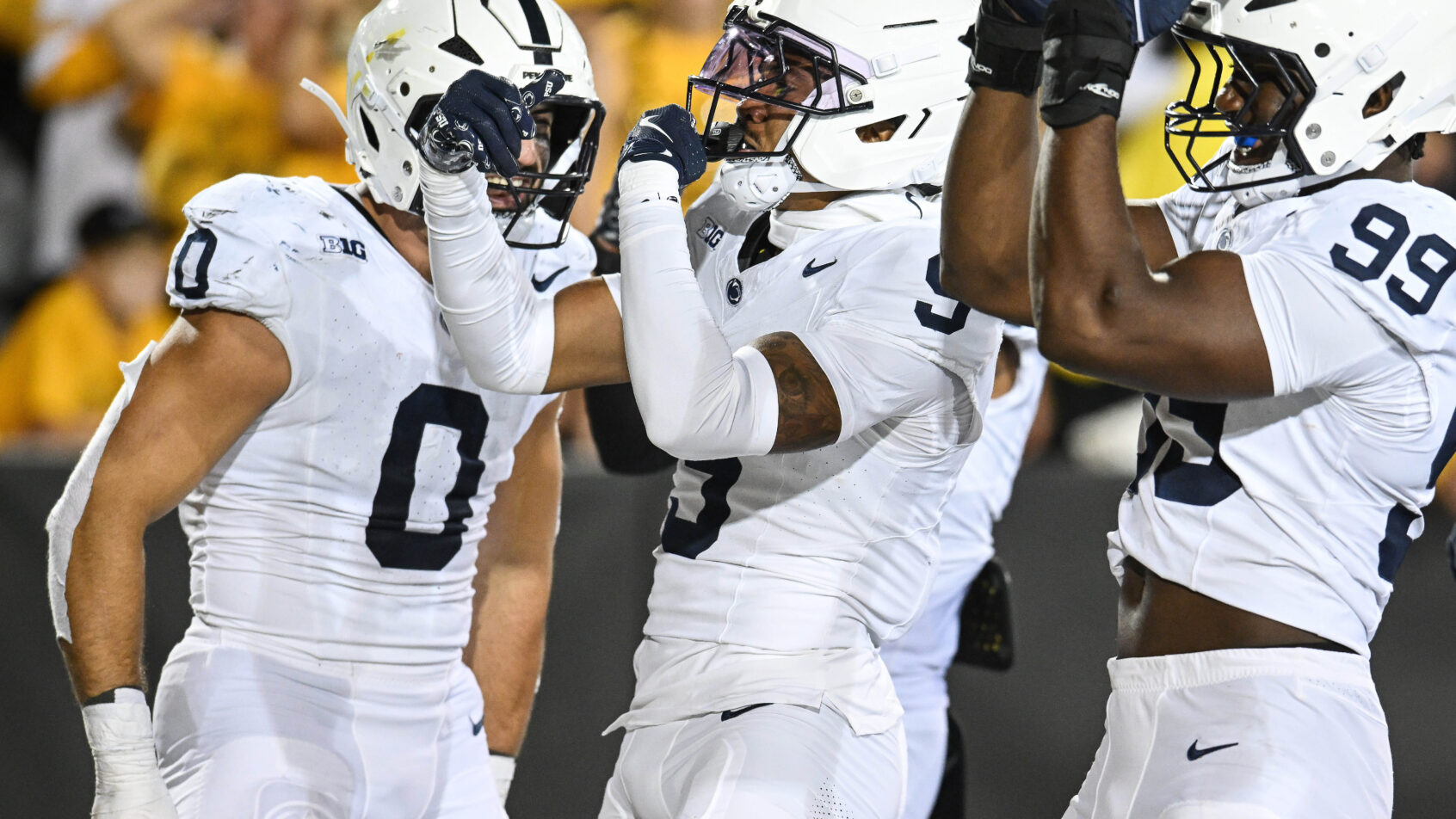 Oct 18, 2025; Iowa City, Iowa, USA; Penn State Nittany Lions cornerback Elliot Washington II (9) reacts with defensive end Yvan Kemajou (99) and linebacker Dominic Deluca (0) after returning a blocked field goal attempt by Iowa Hawkeyes kicker Drew Stevens (not pictured) 35 yards for a touchdown on the final play of the second quarter at Kinnick Stadium. Mandatory Credit: Jeffrey Becker-Imagn Images