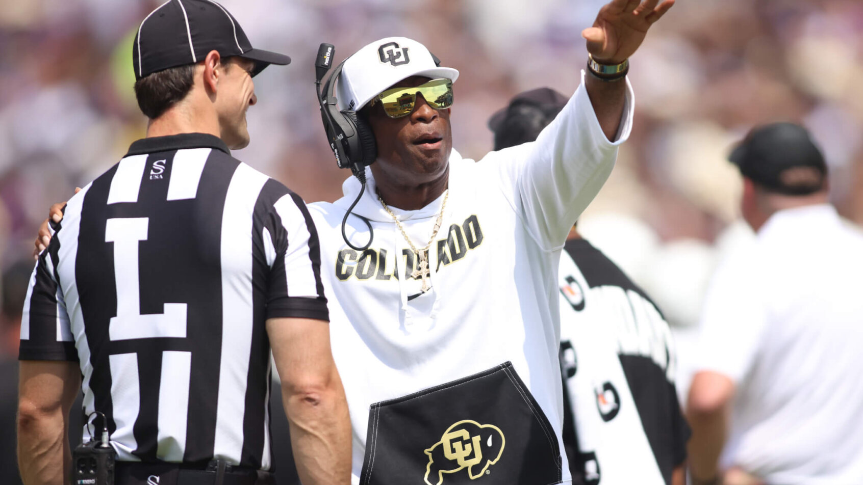 Sep 2, 2023; Fort Worth, Texas, USA; Colorado Buffaloes head coach Deon Sanders talks to line judge Bret bascule in the second quarter against the TCU Horned Frogs at Amon G. Carter Stadium. Mandatory Credit: Tim Heitman-USA TODAY Sports