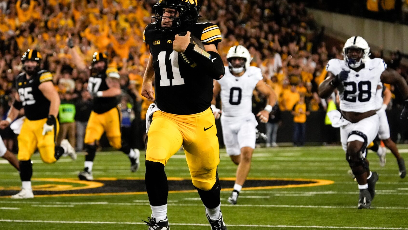 Iowa Hawkeyes quarterback Mark Gronowski (11) carries the ball down field during a college football game against the Penn State Nittany Lions Oct. 18, 2025 at Kinnick Stadium in Iowa City, Iowa.