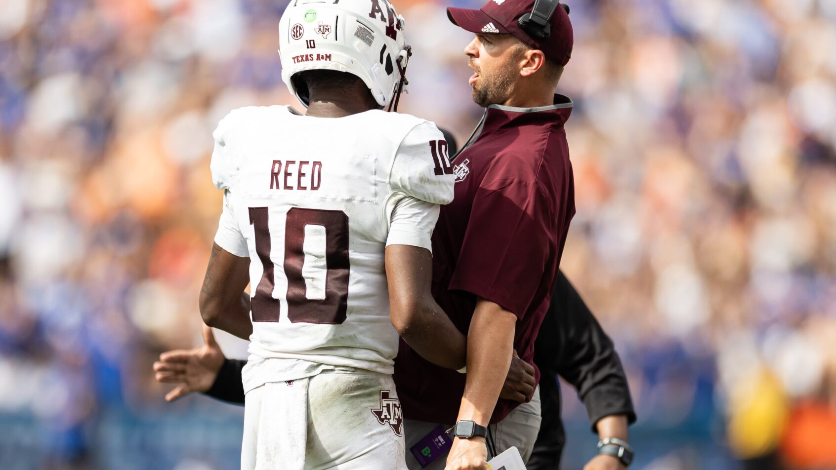 Sep 14, 2024; Gainesville, Florida, USA; Texas A&M Aggies quarterback Marcel Reed (10) celebrates with Texas A&M Aggies offensive coordinator Collin Klein after a touchdown against the Florida Gators during the first half at Ben Hill Griffin Stadium. Mandatory Credit: Matt Pendleton-Imagn Images
