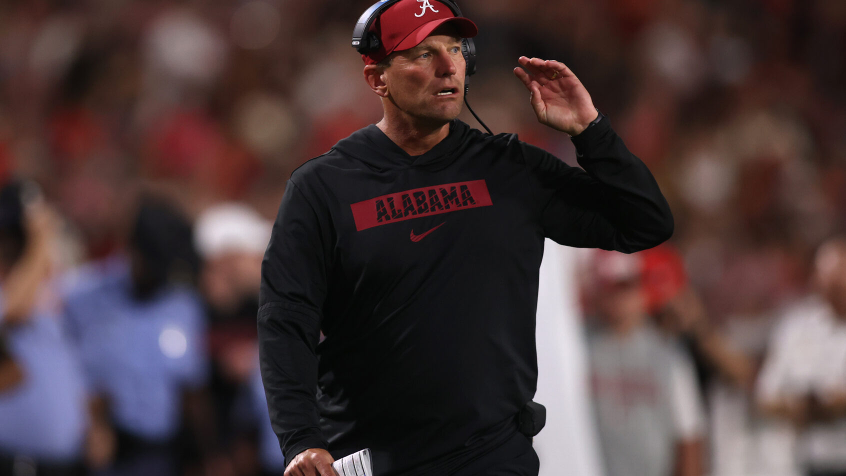 Sep 27, 2025; Athens, Georgia, USA; Alabama Crimson Tide head coach Kalen DeBoer looks on in the second half against the Georgia Bulldogs at Sanford Stadium. Mandatory Credit: Brett Davis-Imagn Images