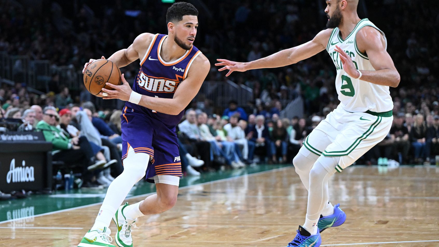 Mar 16, 2026; Boston, Massachusetts, USA; Phoenix Suns guard Devin Booker (1) drives to the basket against Boston Celtics guard Derrick White (9) during the first half at the TD Garden. Mandatory Credit: Brian Fluharty-Imagn Images