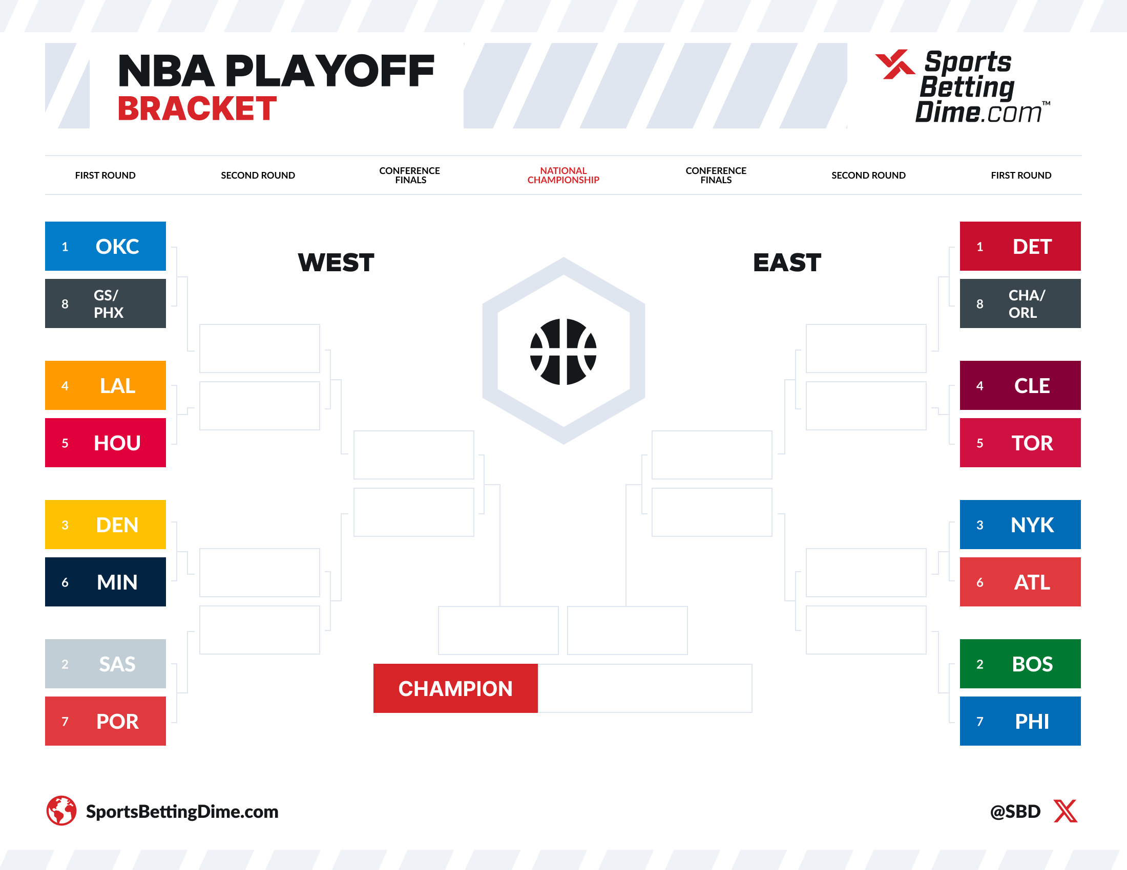 Click on the image below to download a printable version of the 2026 NBA playoff bracket. Under the bracket, find the first-round NBA playoff schedule, as far as it has been set by the league.