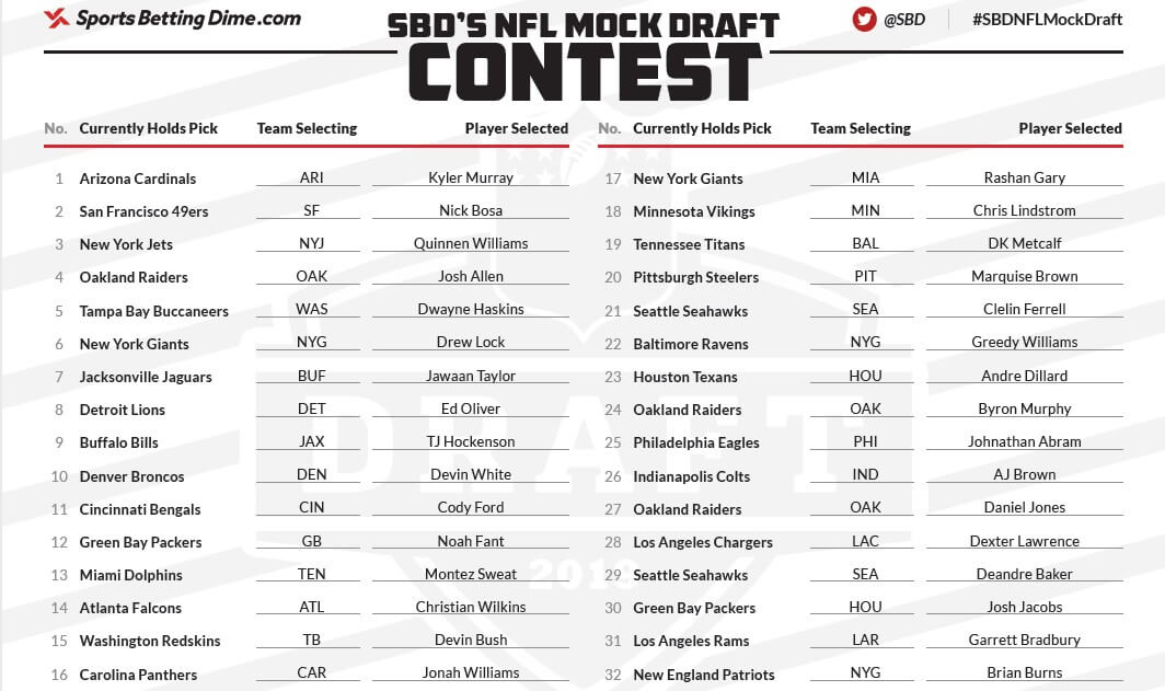 Want to fill out your own first-round mock draft and take on the sportsbooks? Head over to our 2019 NFL Mock Draft Contest to fill out your own version.