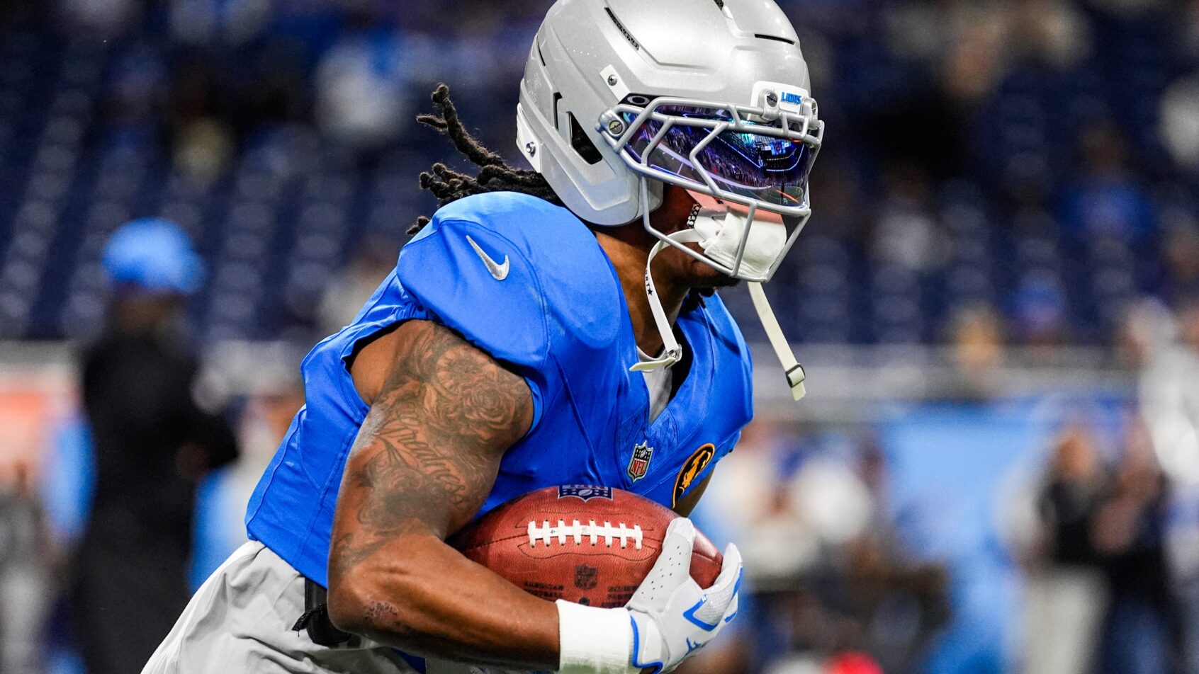 Detroit Lions running back Jahmyr Gibbs (0) warms up ahead of the Green Bay Packers game at Ford Field in Detroit on Thursday, Nov. 27, 2025.