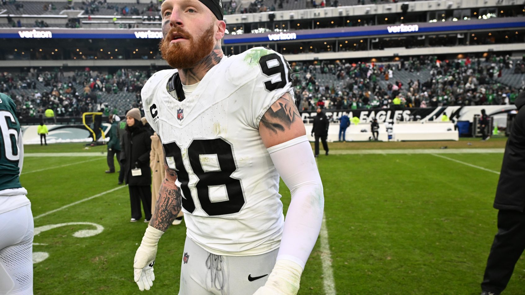 Dec 14, 2025; Philadelphia, Pennsylvania, USA; Las Vegas Raiders defensive end Maxx Crosby (98) on the field after loss to the Philadelphia Eagles at Lincoln Financial Field. Mandatory Credit: Eric Hartline-Imagn Images