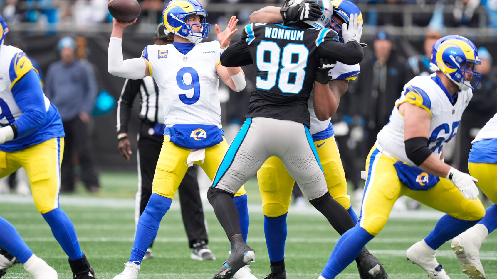 Nov 30, 2025; Charlotte, North Carolina, USA; Los Angeles Rams quarterback Matthew Stafford (9) throws a pass during the first quarter against the Carolina Panthers at Bank of America Stadium. Mandatory Credit: Jim Dedmon-Imagn Images