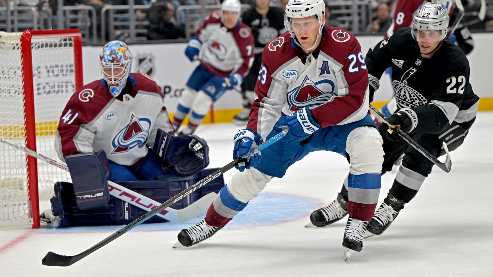Oct 7, 2025; Los Angeles, California, USA; Colorado Avalanche center Nathan MacKinnon (29) controls the puck away from Los Angeles Kings left wing Kevin Fiala (22) during the second period at Crypto.com Arena. Mandatory Credit: Jayne Kamin-Oncea-Imagn Images