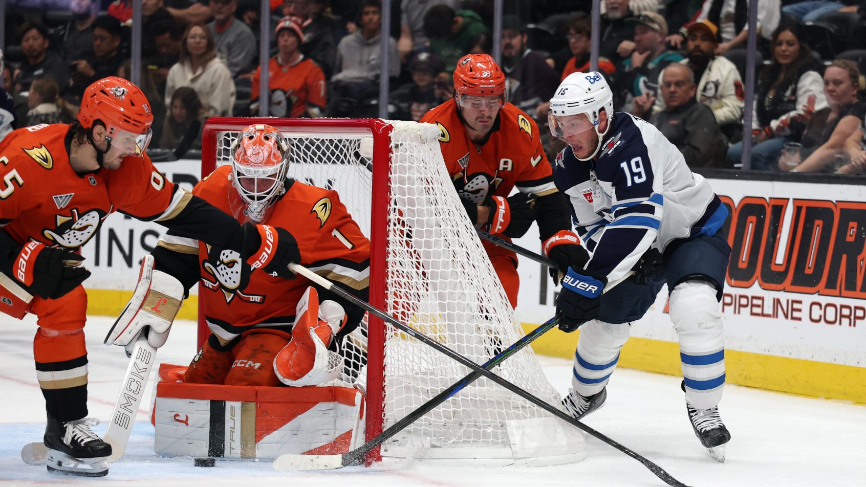 Nov 9, 2025; Anaheim, California, USA; Anaheim Ducks goaltender Lukas Dostal (1) blocks a shot by Winnipeg Jets center Jonathan Toews (19) during the first period at Honda Center. Mandatory Credit: Kiyoshi Mio-Imagn Images