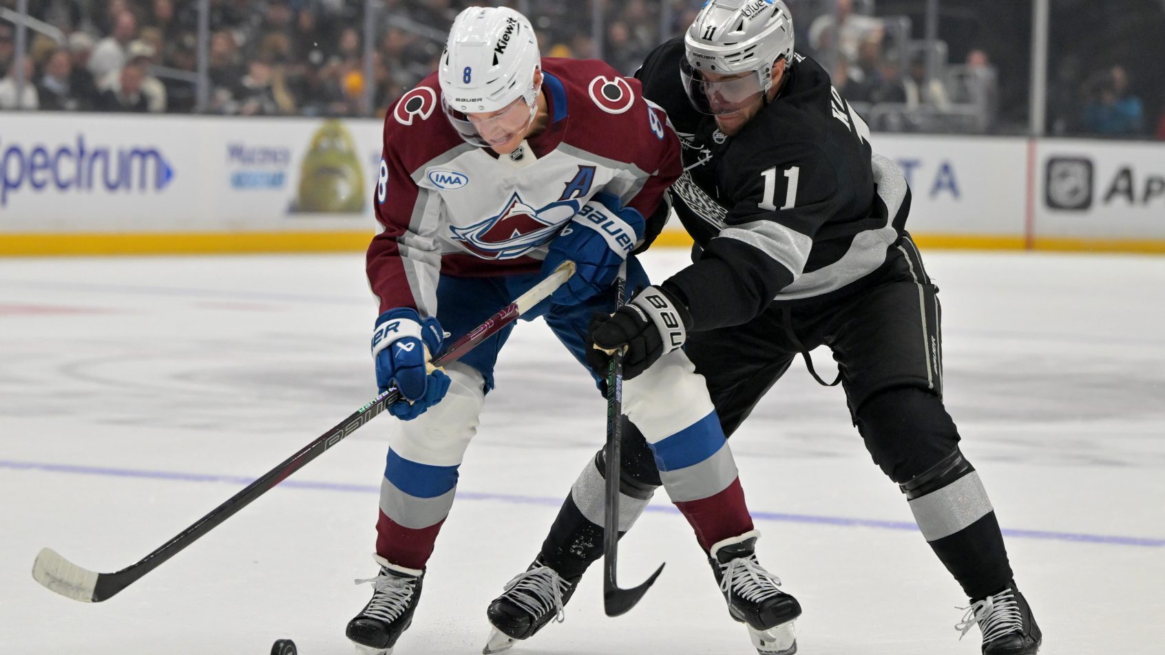 Oct 7, 2025; Los Angeles, California, USA; Colorado Avalanche defenseman Cale Makar (8) and Los Angeles Kings center Anze Kopitar (11) battle for the puck during the first period at Crypto.com Arena. Mandatory Credit: Jayne Kamin-Oncea-Imagn Images