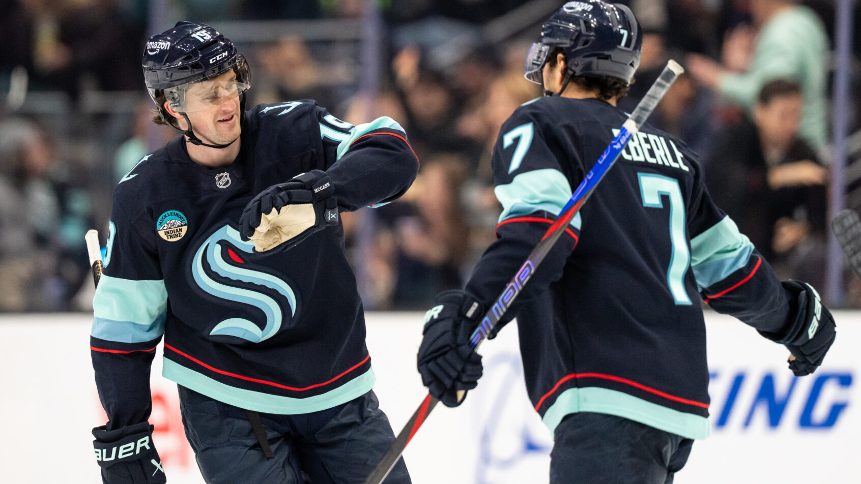 Jan 29, 2026; Seattle, Washington, USA; Seattle Kraken forward Jared McCann (19) celebrates with Seattle Kraken forward Jordan Eberle (7) after scoring a goal during the third period against the Toronto Maple Leafs at Climate Pledge Arena. Mandatory Credit: Stephen Brashear-Imagn Images