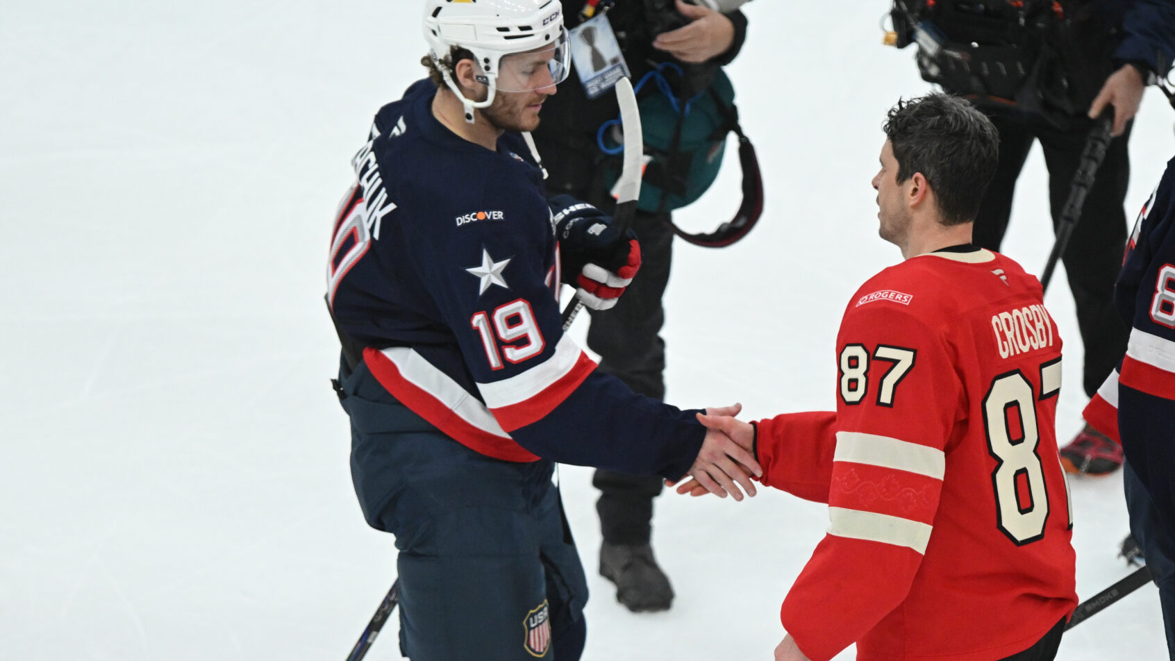 Feb 20, 2025; Boston, MA, USA; [Imagn Images direct customers only] Team USA forward Matthew Tkachuk (19) shakes hands with Team Canada forward Sidney Crosby (87) after overtime win by Team Canada during the 4 Nations Face-Off ice hockey championship game at TD Garden. Mandatory Credit: Brian Fluharty-Imagn Images