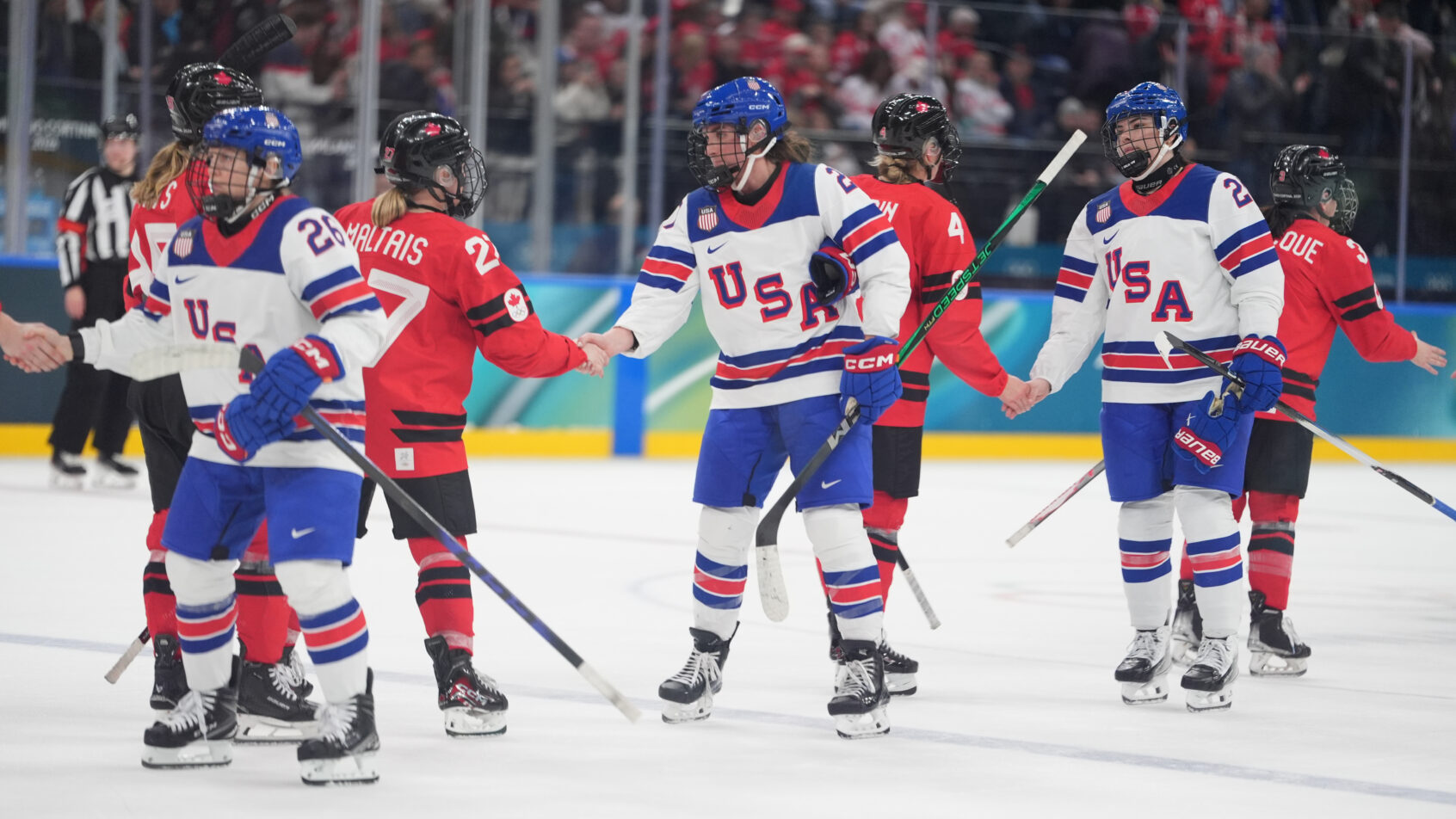 Feb 10, 2026; Milan, Italy; United States and Canada players shake hands after playing in women's ice hockey group A play during the Milano Cortina 2026 Olympic Winter Games at Milano Santagiulia Ice Hockey Arena. Mandatory Credit: Amber Searls-Imagn Images